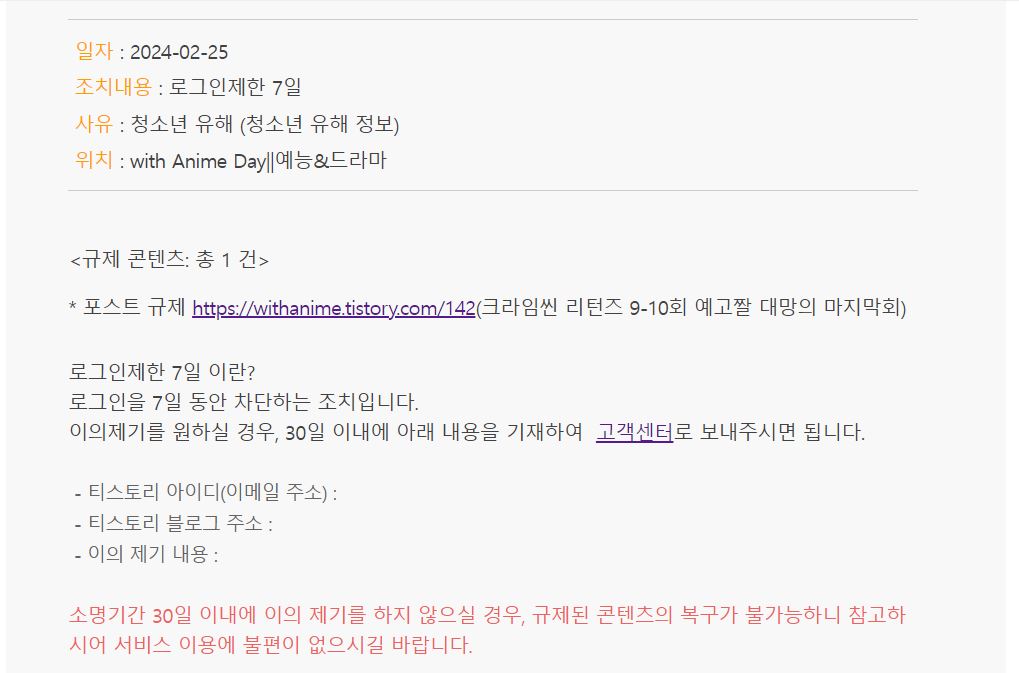 본방 스샷도 아니고 예고편 스샷을 올린 게 다 인데, 청소년 유해글로 일주일간 계정 정지 먹었습니다.