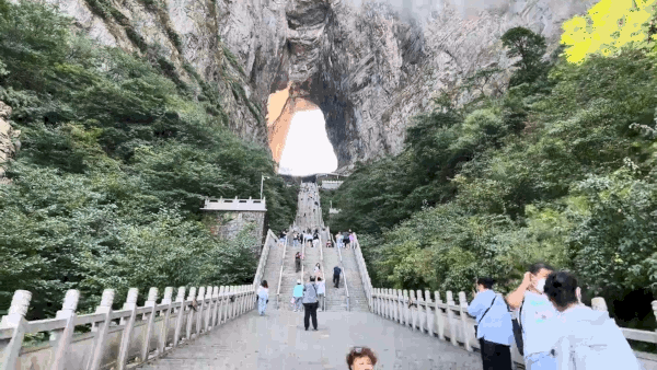 해발 1,300m의 암벽에 형성된 이 동굴은 높이 131.5m, 넓이 57m, 깊이 60m로 거대하고 수시로 안개로 뒤덮여 신선이 된 듯한 느낌을 주어 진짜 하늘에 다다른 느낌을 갖게 만든다. 특히 이 동굴은 1999년, 세계 에어쇼에서 비행기가 이 동굴을 통과하고 지나면서 세계적으로 유명해졌는데 그때 무려 8억 명이 에어쇼 생방송을 시청하였다고 한다. 천문산 중간에 있는 공원에서 천문동을 오르는 길은 999개의 가파른 계단을 이용하게 되는데 마치 천상으로 오르는 듯 묘한 기분이 들게 한다.