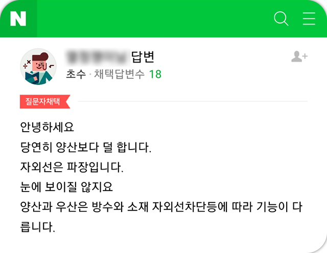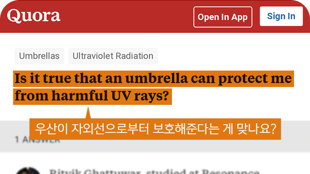 그런데 답변들이 갈린다. 우산이 자외선 차단에 효과가 있다는 쪽과 없다는 쪽의 의견들이 섞여 있었다. 이러니 더 헷갈린다.