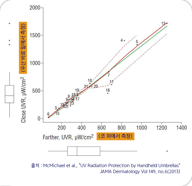 아래 X축은 코 위에서 측정한 자외선, 왼쪽 Y축은 우산 바로 밑에서 측정한 자외선이다. 그래프에 표시된 숫자는 우산에 부여된 숫자이다. 복잡하다. 분석하지 않으셔도 된다. 간단히 정리해드리겠다. 23개 우산의 자외선 차단율은 77~99%였다. 여기서 주목할 부분은 이거다. 가장 효과가 없는 우산도 77%의 자외선을 차단했다는 점이다. 하얀색 일반 우산이었다. UV코팅이 된 우산보다 효과는 떨어지지만 안 쓰는 것보다는 훨씬 낫다는 거다.