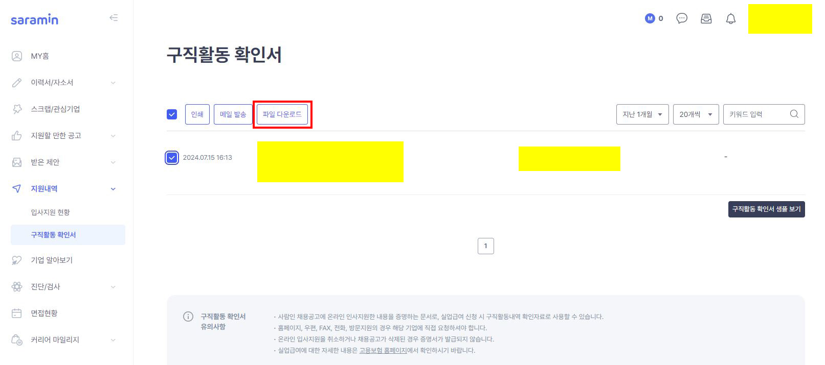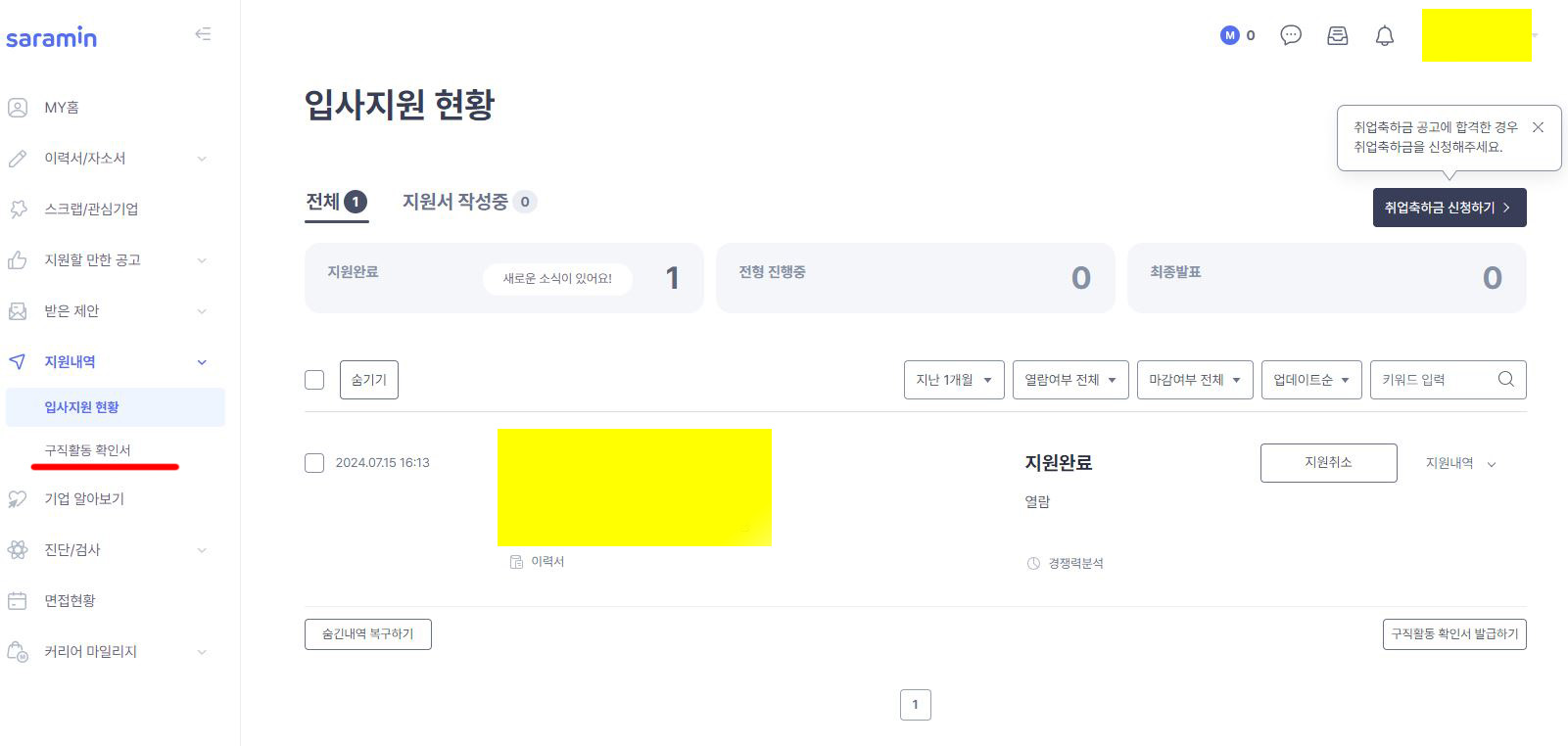 3) 지원내역을 누르시면 입사지원 현황 아래 구직활동 확인서가 있습니다.