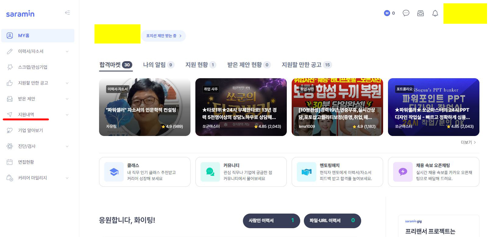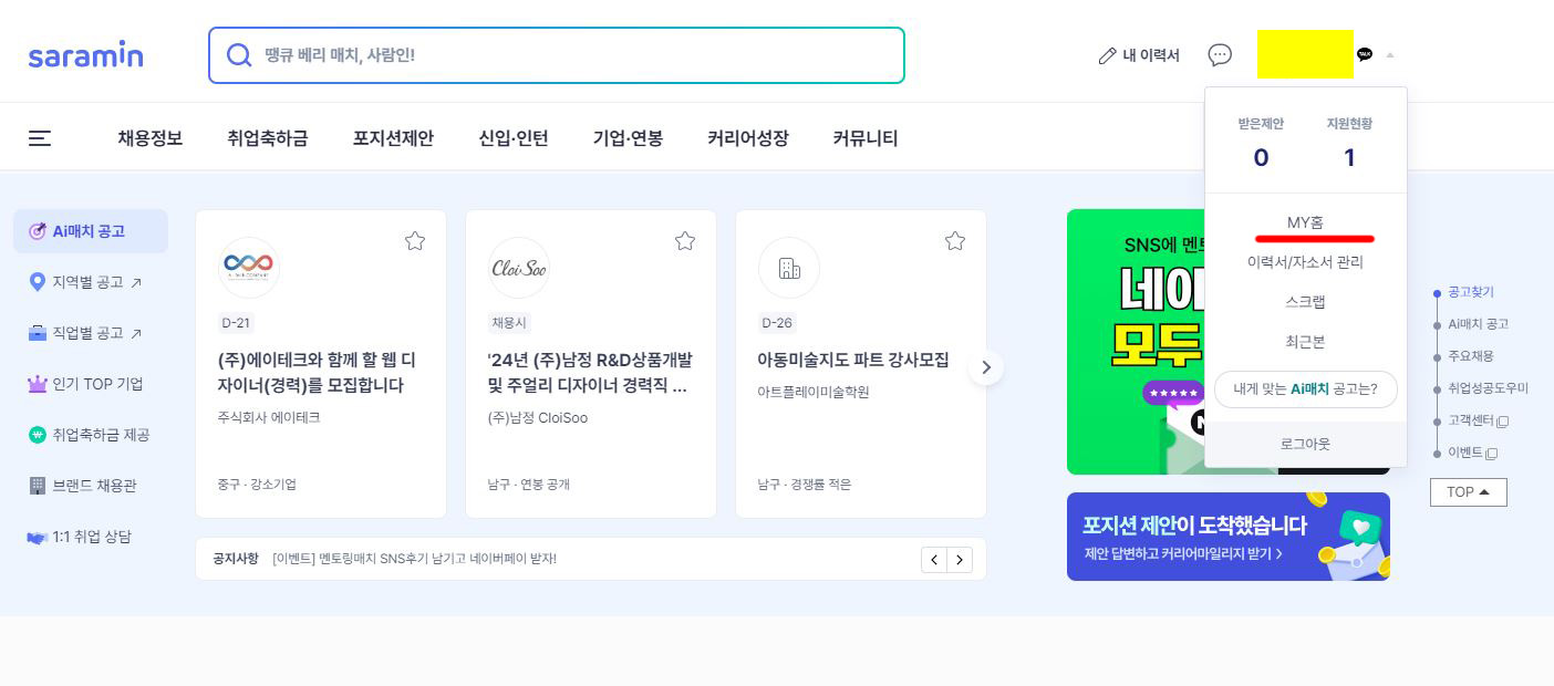 1) 일단 사람인 로그인을 합니다. 그리고 MY홈을 누릅니다.