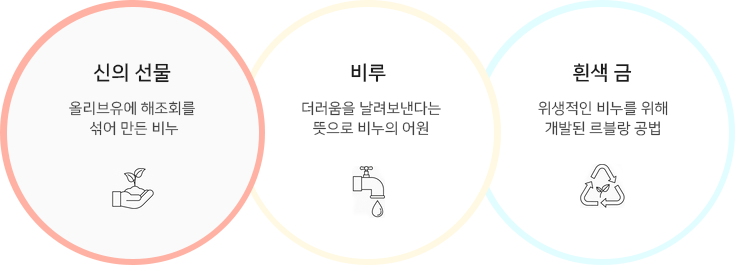 종교와 관계가 깊은 비누는 그래서 "신의 선물"이라고 불리워집니다.그후 비누는 지금의 시리아를 거쳐 지중해 연안을 따라 서쪽으로 가면서 발달했으며 17세기경에는 프랑스의 마르세이유 지방에서 절정에 이르게 됩니다. 당시 올리브유에 해조회를 섞어 만든 비누는 대단히 질이 좋은 것 이었습니다.