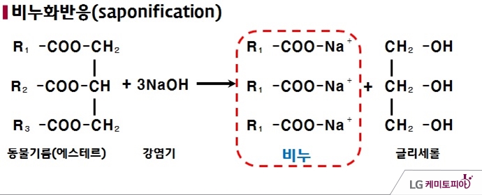 이것은 비누를 합성하는 비누화 반응식입니다. 동물성 지방과 흔히 양잿물이라고 하는 NaOH를 반응시켜주게 되면 비누와 글리세롤이 나오게 됩니다. 참고로 글리세롤은 OH기가 3개나 달려있어서 물을 아주 좋아해서 로션과 같은 화장품을 만들 때 사용된답니다.