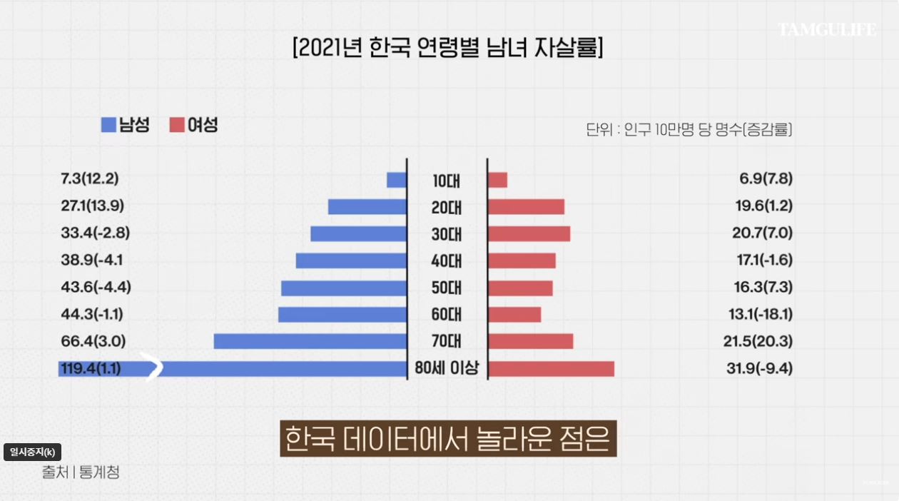 한국의 남녀별 자살률을 봤어요. 한국 데이터의 놀라운 점은 10대의 경우 안타깝게 스스로 목숨을 끊는 일이 남녀 비율에 큰 차이가 없어요. 20에서 29세 사이일 때 남성의 자살률이 여성보다 1.5배 많아요. 하지만 연령대가 올라가서 30세에서 39세가 되면 남성의 자살률이 2배 더 높아요. 그러다 50,60세가 되면 3배가 되죠. 미국이나 영국의 사례처럼 4배, 8배까지는 아니지만.