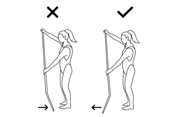 SUP 패들을 잡을 때 블레이드의 각도가 몸의 반대쪽을 향하고 있는지 확인하도록 하세요.