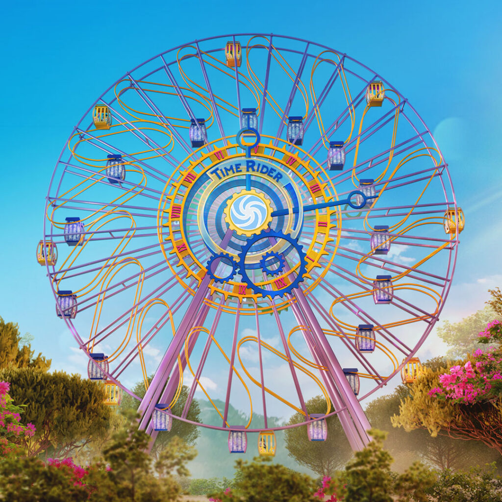 '타임 라이더'는 '코스터 휠(Coaster Wheel)'이라는 어트랙션 기종으로, 일반 대관람차처럼 고정되어 천천히 회전하는 캐빈도 있지만, 롤러코스터 트랙 같은 곳에 매달려 위치와 각도에 따라 미끄러지고 흔들리는 캐빈도 있는 독특한 대관람차 어트랙션입니다.