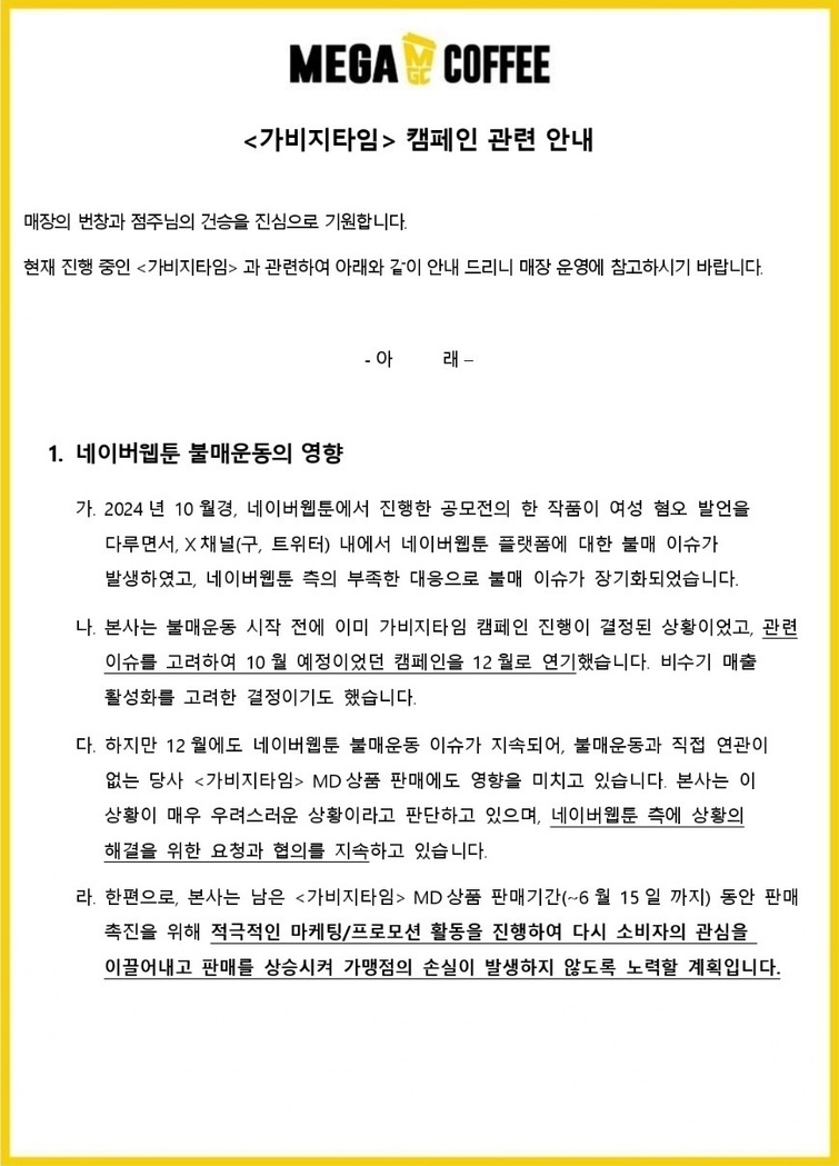 메가커피는 공지를 통해 "네이버퉵툰에서 진행한 공모전의 한 작품이 여성 혐오 발언을 다루면서 X(구, 트위터) 내에서 네이버웹툰 플랫폼에 대한 불매 이슈가 발생했다"며 "네이버웹툰 측의 부족한 대응으로 불매 이슈가 장기화됐다"고 말했다.