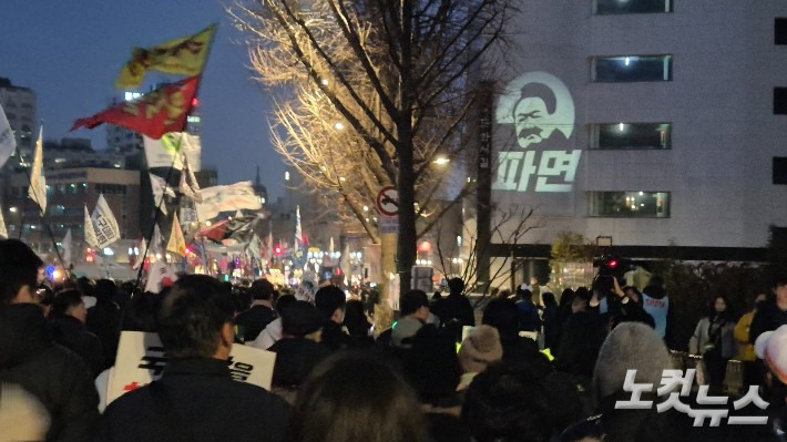 윤석열 퇴진·사회대개혁 비상행동(비상행동)은 1일 종로구 정부서울청사 사거리에서 윤석열 대통령의 탄핵을 요구하는 집회를 진행한 뒤 종로구 헌법재판소로 행진했다. 주보배 기자