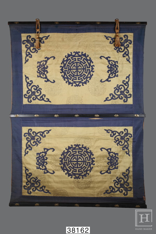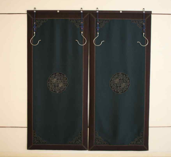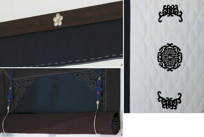 3 무렴자를 든든히 잡아주는 나무틀에는 주석으로 만든 꽃모양 장석을 붙였다. 4 무렴자를 말아 걸어두는 고리는 김은영 매듭장의 매듭으로 장식했다. 5 서온돌 누비 무렴자 중앙에는 문자 문양을, 그 아래와 위에는 4 행복을 상징하는 박쥐 문양을 박음질했다. [출처:중앙일보] https://www.joongang.co.kr/article/20157933