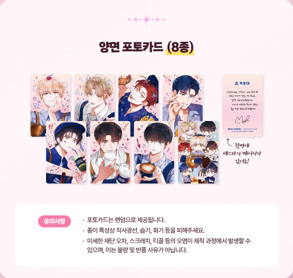 1. 오프라인 매장에서 콜라보 세트 주문 시 랜덤 증정 포토카드 8종 (개인 7종+단체 1종)
