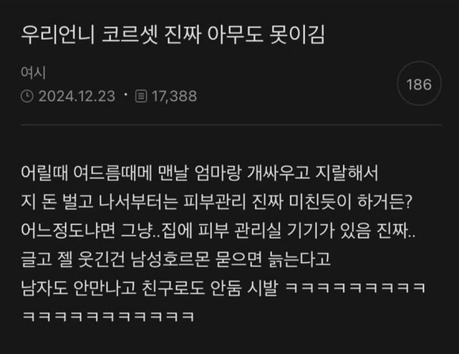 최근 인스타그램에서 한 커뮤니티 글이 화제가 됐다. 글쓴이의 언니가 “남성 호르몬이 피부 노화를 촉진한다”는 이야기를 듣고 남성과의 접촉을 최소화하고 있다는 내용