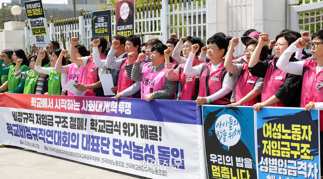 [주간경향] 지난 4월 초 대전 둔산여고에서는 등굣길 학부모들의 피켓 시위가 한동안 이어졌다. 배경은 저녁 급식 중단이다. 급식실 조리실무사(이하 조리사)들의 반나절 파업 이후 이 학교 교사와 학부모들이 참여하는 학교 운영위원회는 저녁 급식 중단을 결정했다. 피켓 시위에 나선 학부모들은 “아이들 볼모로 하는 쟁의행위 철회하라”, “금년 수능 계획 무너졌다. 조리사들은 각성하라”라며 조리사들을 비판했다. 며칠 뒤에는 학교 학생회가 “학생들의 건강권을 위협하는 행위는 절대 바람직하지 않다”는 내용의 대자보를 붙였다. 학생회는 이 글에 전교생 740여명 중 640명의 서명을 받아 조리사들에게 전달했다. 교사단체인 한국교원단체총연합회(교총)는 “학생들의 급식을 볼모로 한 집단행위가 반복된 데 대해 개탄스럽고, 즉각적인 중단을 촉구한다”고 했다.