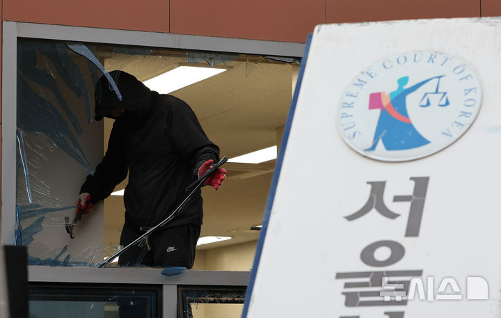 [서울=뉴시스] 황준선 기자 = 19일 오후 서울 마포구 서울서부지방법원에서 작업자들이 윤석열 대통령 지지자들의 난입으로 파손된 시설들을 청소하고 있다. 2025.01.19. hwang@newsis.com