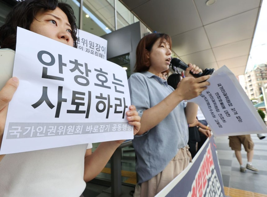 시민사회단체 국가인권위원회바로잡기공동행동이 지난 4일 서울 중구 국가인권위원회 앞에서 안창호 인권위원장 사퇴 촉구 기자회견을 하고 있다. 연합뉴스