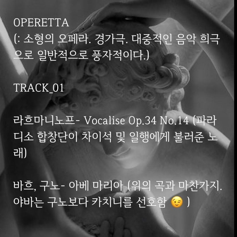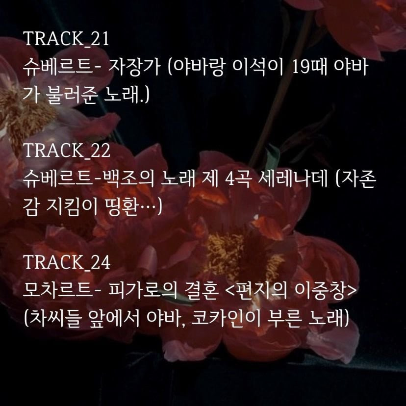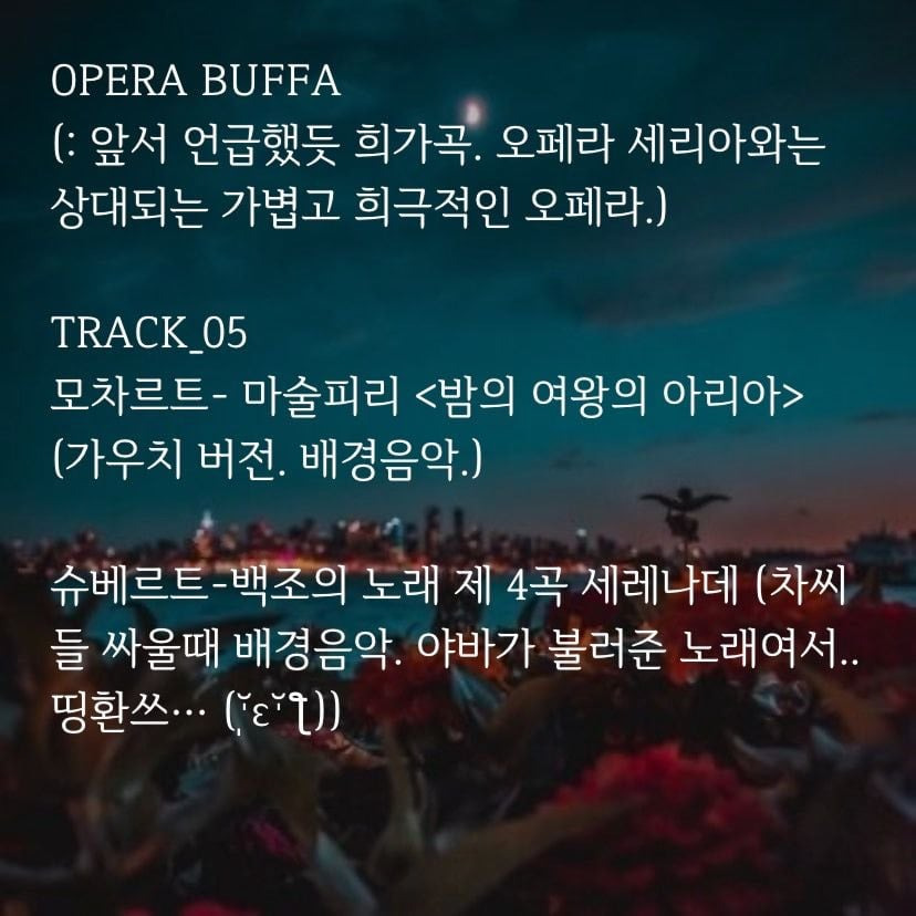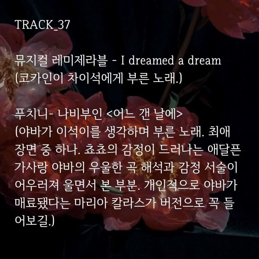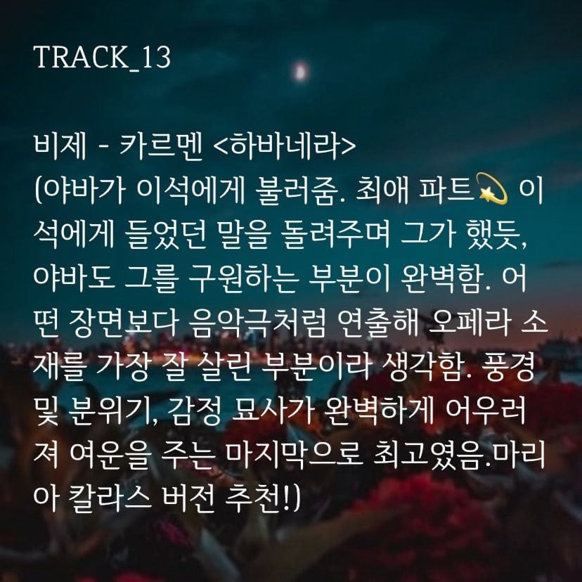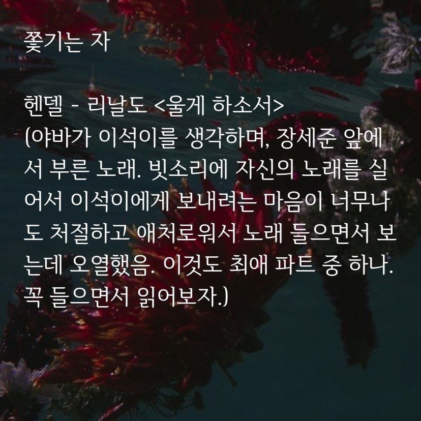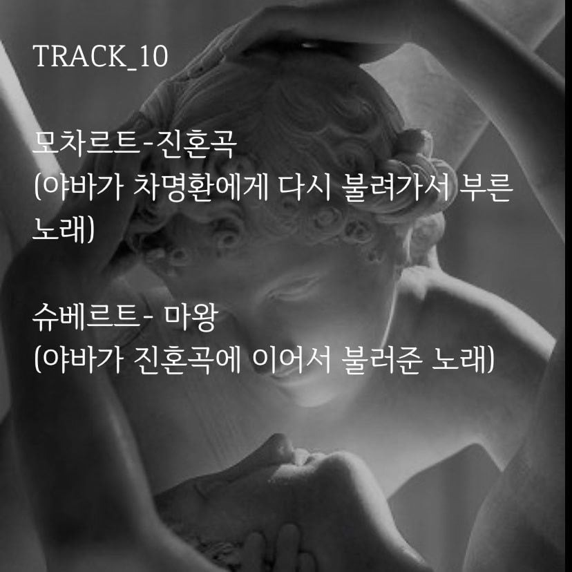 (야바가 이석에게 불러줌. 최애 파트💫 이석에게 들었던 말을 돌려주며 그가 했듯, 야바도 그를 구원하는 부분이 완벽함. 어떤 장면보다 음악극처럼 연출해 오페라 소재를 가장 잘 살린 부분이라 생각함. 풍경 및 분위기, 감정 묘사가 완벽하게 어우러져 여운을 주는 마지막으로 최고였음.마리아 칼라스 버전 추천!)