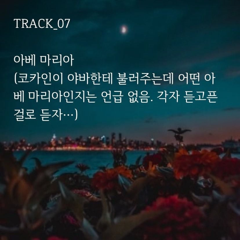 아베 마리아 (코카인이 야바한테 불러주는데 어떤 아베 마리아인지는 언급 없음. 각자 듣고픈 걸로 듣자…)