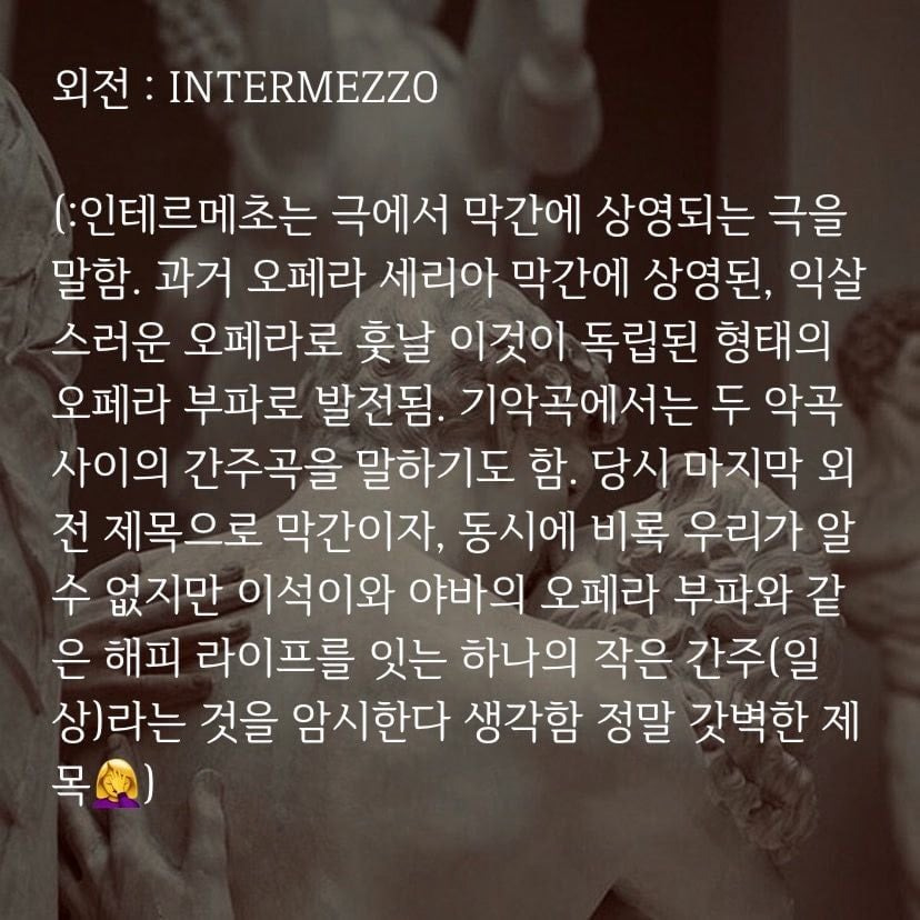 (: 인테르메초는 극에서 막간에 상영되는 극을 말함. 과거 오페라 세리아 막간에 상영된, 익살스러운 오페라로 훗날 이것이 독립된 형태의 오페라 부파로 발전됨. 기악곡에서는 두 악곡 사이의 간주곡을 말하기도 함. 당시 마지막 외전 제목으로서, 막간이자 동시에 우리가 비록 알 수 없지만 이석이와 야바의 오페라 부파와 같은 해피 라이프를 잇는 하나의 작은 간주라는 것을 암시한다 생각함 정말 갓벽한 제목🤦♀️)